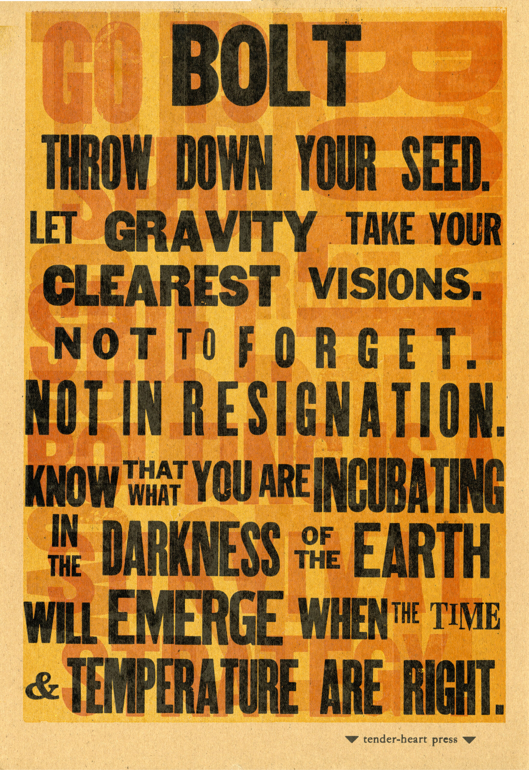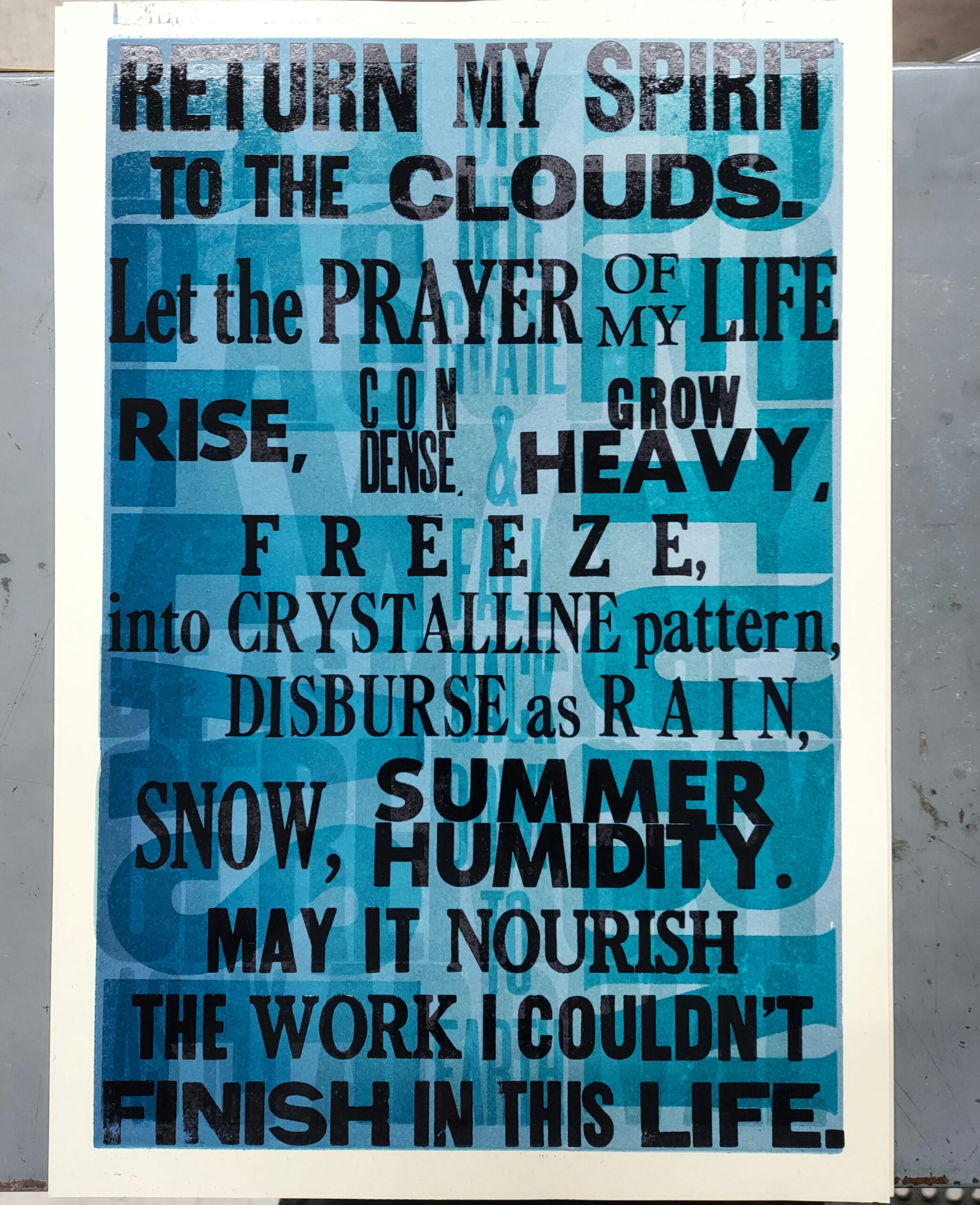 This workshop will guide you through distilling your most potent wish, spell or prayer, which will become a letterpress poster. Oscar will guide participants through the writing and editing process to get to a succinct and powerful message. Together the class will go through the steps to create a multi-layered poster with multiple “reads” by layering text and image, and finally over-printing a last layer in dense black ink.