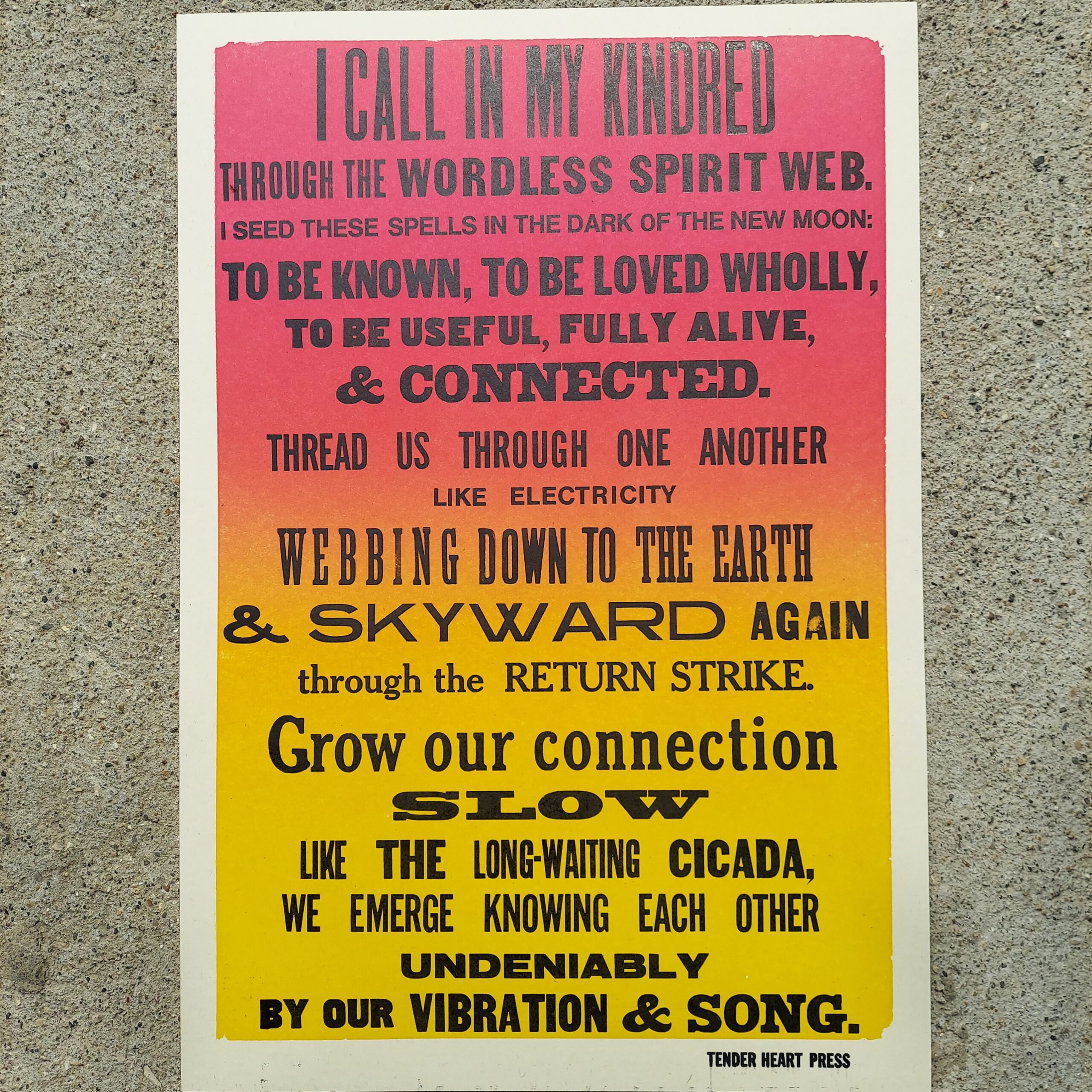 Tender-Heart Press was founded by E. “Oscar” Maynard in 2017 in Oakland, CA. Oscar makes letterpress posters rooted in heart wisdom, collective healing, and liberatory spellwork. These prints are made from hand-laid type, and they are cranked through a vintage printing press, one by one. Their posters have been used on altars and in ceremonies. In 2018, one of their posters was turned into a sung prayer by Jewish Priestess, Taya Ma.