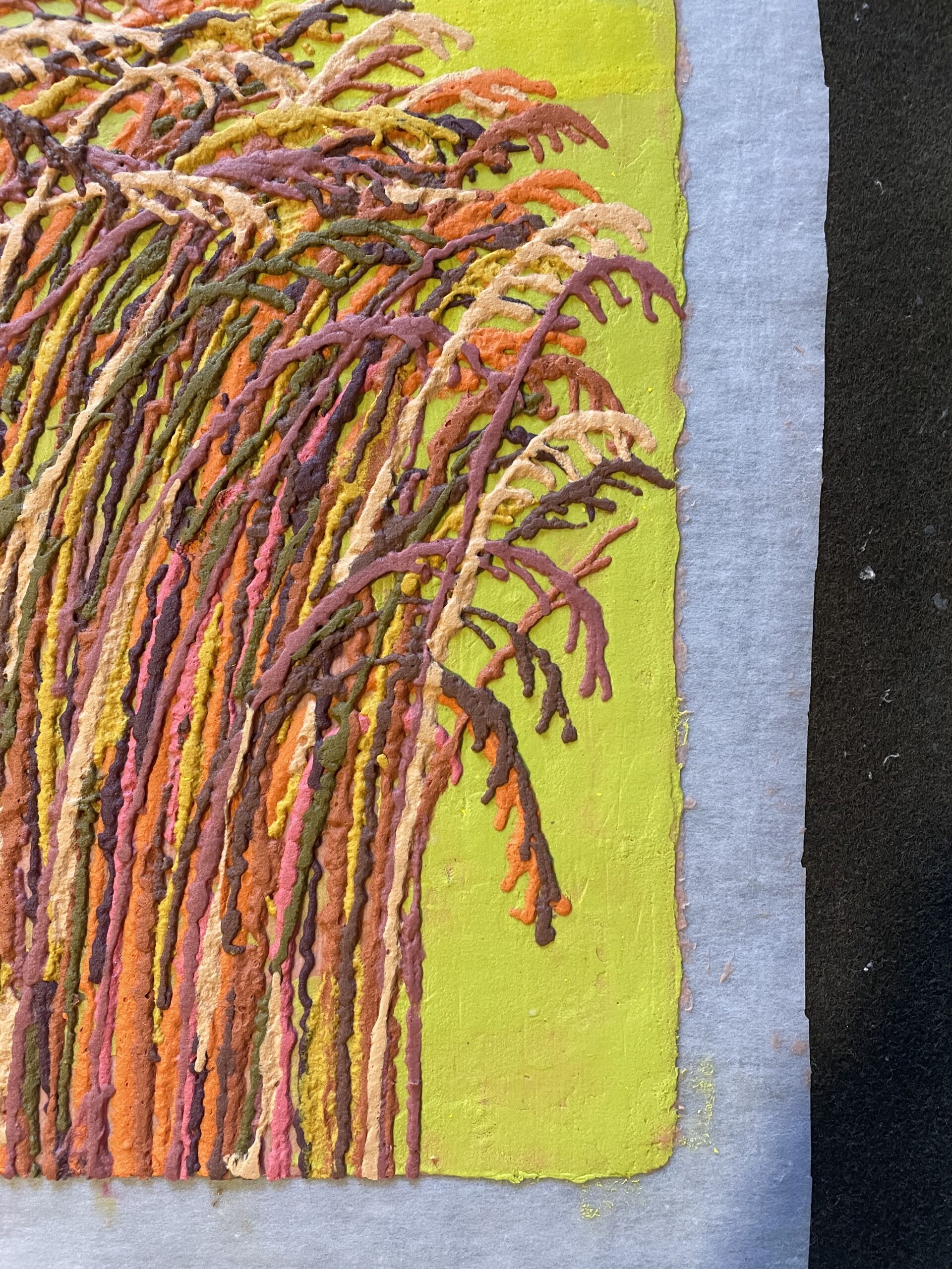 Claudia Borfiga is a visual artist, compelled to capture the wonders of the natural world and connect community through a range of mediums including paper, textiles, and print. Her joy for the outdoors is evident in the work she makes, leaning into dreamscapes through the use of color and texture. She was an artist-in-residence at WSW in the Winter of 2023. Initially, she intended to spend her time in the screen print studio but became enamored with learning to pulp paint. She has been a teaching artist for over 10 years and encourages a playful engagement in creative workshops.